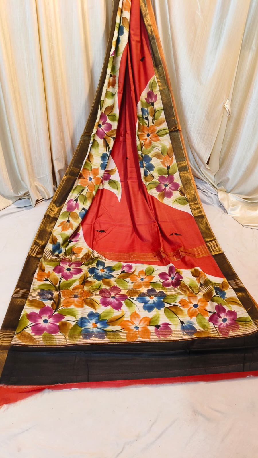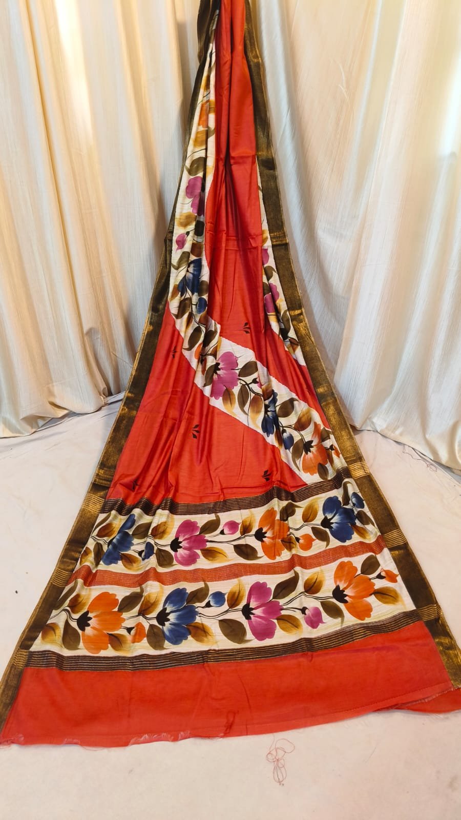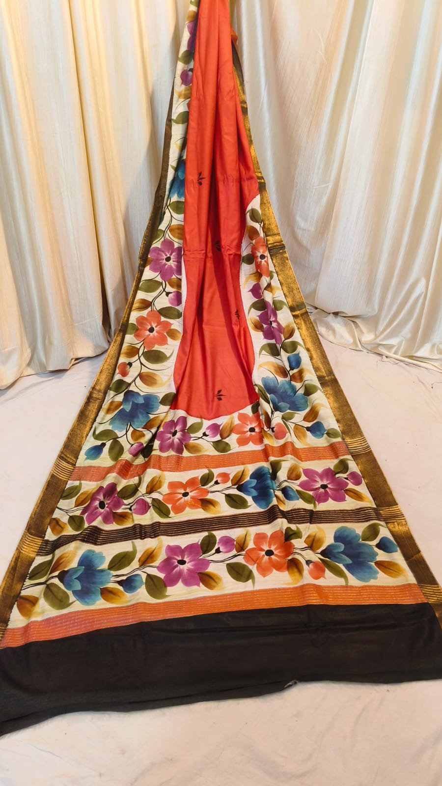 Embrace timeless elegance with our Chanderi Batik Saree. This exquisite drape features a soft, breathable fabric that flows beautifully for any occasion. The body is meticulously decorated with hand-block printed flower motifs, creating a vibrant and artistic look. A striking golden border adds a touch of royalty, making it a versatile choice for both daytime celebrations and evening gatherings.