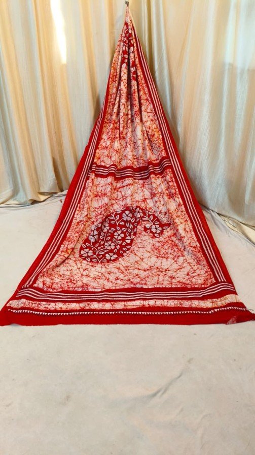 Elevate your ethnic wardrobe with this exquisite Batik Kantha Hand-Stitch Saree. This piece represents the perfect marriage of wax-resist batik art and the soulful precision of Kantha embroidery. The vibrant red body is adorned with a stunning Mango (Aam) motif Kalka, intricately filled with colorful floral hand-stitching. Every inch of the saree body and border is totally hand-stitched, showcasing a level of craftsmanship that is both rare and beautiful. Ideal for festive occasions, cultural events, or elegant evening wear.