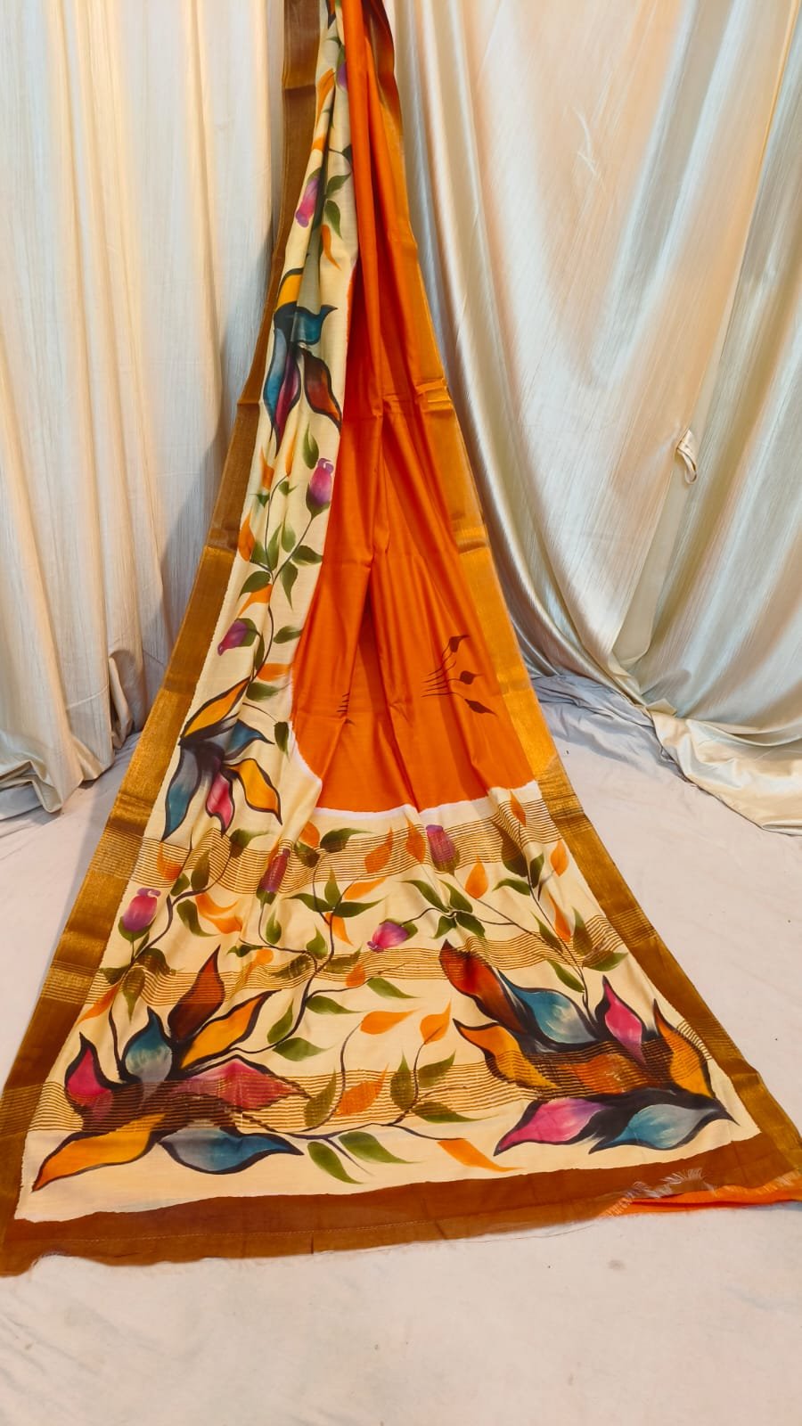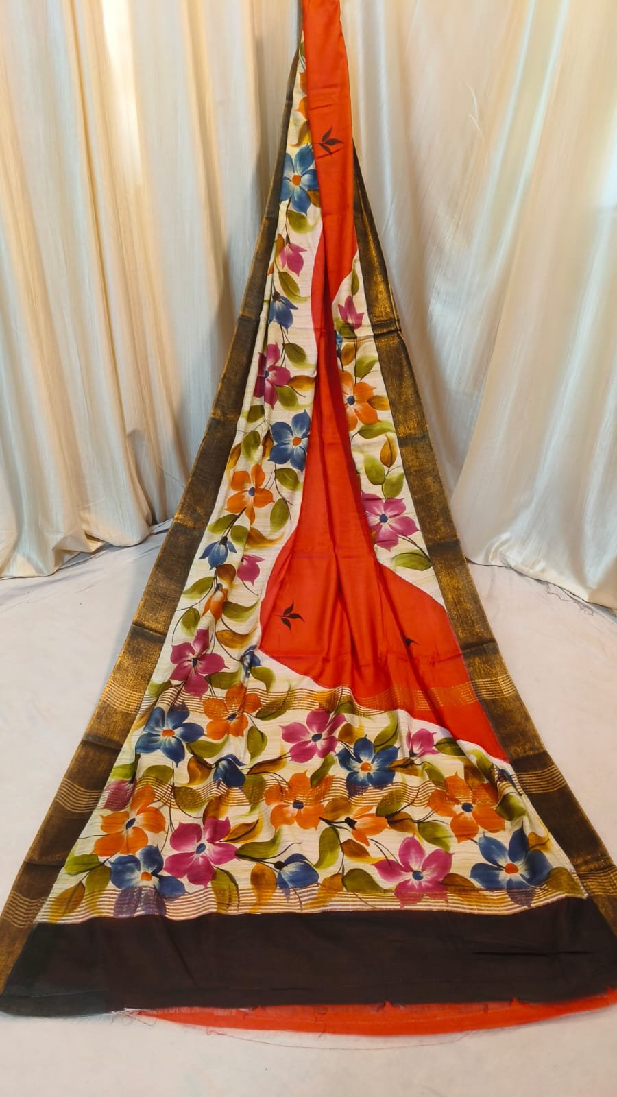 Embrace timeless elegance with our Chanderi Batik Saree. This exquisite drape features a soft, breathable fabric that flows beautifully for any occasion. The body is meticulously decorated with hand-block printed flower motifs, creating a vibrant and artistic look. A striking golden border adds a touch of royalty, making it a versatile choice for both daytime celebrations and evening gatherings.
