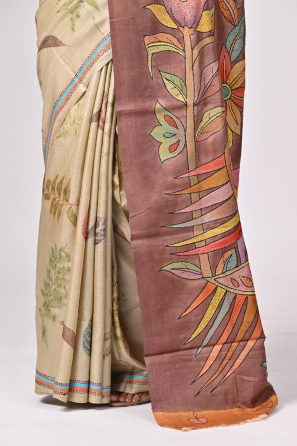 Beige Eco Print Floral Pure Tussar Kantha Saree